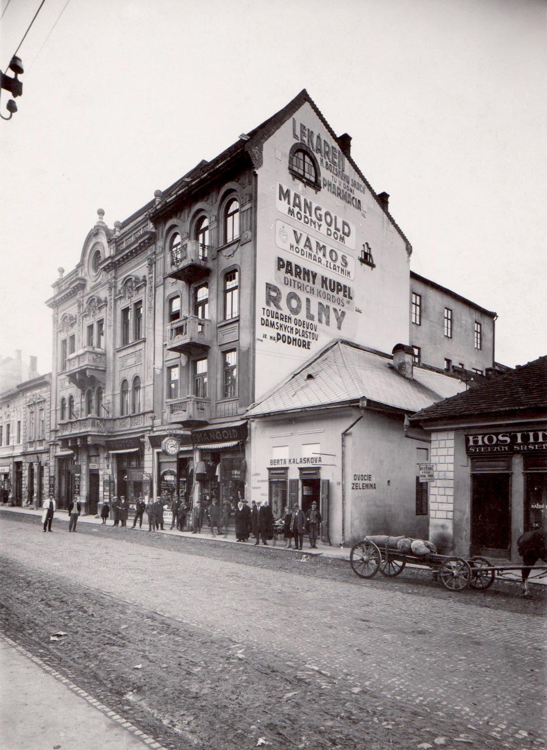 Fotografia, ktorú som vybral, zachytáva dva veľké mestské secesné domy. Ukazuje ich v plnej kráse krátko po dokončení. Aj vďaka tejto fotografii vieme, ako tieto secesné skvosty v Ružomberku na začiatku 20. storočia vyzerali. Vidíme na nich aj časť ornamentálnej výzdoby, ktorá sa, žiaľ, do dnešných dní nezachovala. Vďaka reklamným pútačom vieme identifikovať, aké obchody sa v domoch nachádzali, a tak si môžeme urobiť predstavu aj o tom, kto do nich chodil. Mangold – tak sa volal obchod s najnovšou módou – navštevovali najmä ľudia, ktorí sa chceli dobre obliecť. A keď sme už pri ľuďoch, na fotografii ich vidíme hneď niekoľko. Kto asi boli? Pravdepodobne majitelia a zamestnanci obchodov, ktorým fotograf povedal, aby vyšli pred budovy a nechali sa odfotiť. A ako asi vyzerali byty v týchto domoch? Je veľká škoda, že fotograf nevstúpil aj do interiérov a neodfotil napríklad jedáleň či knižnicu. Vedeli by sme, ako ľudia jedli, akými obrazmi mali skrášlené interiéry, aké knihy čítali. Vedeli by sme o nich oveľa viac než len to, že pán Mangold mal módny dom a umožnil Ružomberčanom pred viac ako storočím vyfintiť sa na švihákov. Je úžasné, že sa tieto fotografie zachovali a že ich niekto odniesol do múzea. Ukazujú nám totiž reálnych ľudí, ktorí chodili po reálnych uliciach a nakupovali v reálnych obchodoch.