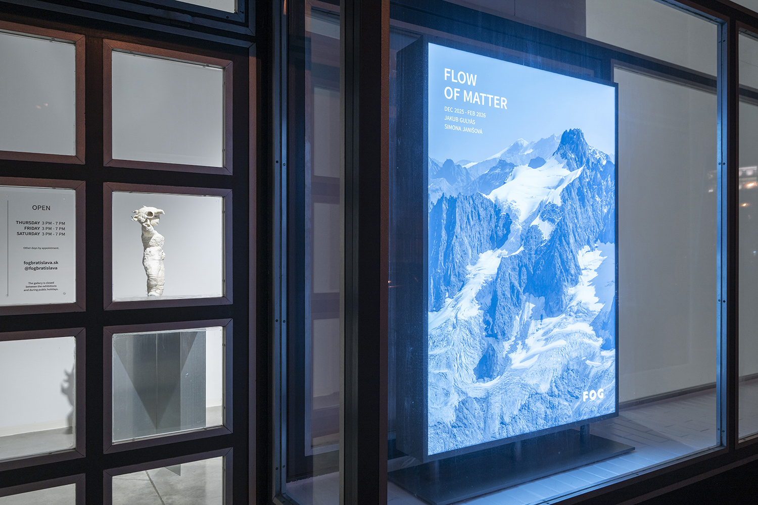 Výstava: TOK HMOTY / autorstvo: Jakub Gulyás, Simona Janišová / kurátori: Dušan Kochol, Sára Jeleňová / miesto: FOG Bratislava / trvanie výstavy: 04. 12. 2025 – 21. 02. 2026